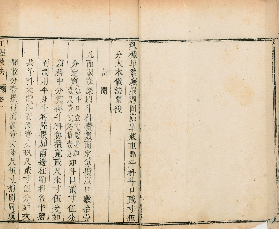 我国古代营造术书流传不多,散见于经典史籍的记载往往偏重礼法制度,而忽略工程技术。专门的建筑营造著录最早上溯至《周官·考工记》(成编于春秋战国之际)。秦汉以来“道器分途、重士轻工”,规矩绳墨之术未能留下完整的文献。至北宋前期,被称为“国朝以来,木工一人而已”的都料匠喻皓,所著《木经》三卷的片段因《梦溪笔谈》而流传下来。直至宋徽宗崇宁二年(1103年),由将作监李诫主持编修的集制度、功限、料例等于一体的集大成之作《营造法式》刊行于世,之后宋刻本、明清钞本、近代印本相续流传。明代官方留下的匠作规程唯存《工部厂库须知》,私家著述的《园冶》《鲁班经匠家镜》等的成就无疑超越前者。