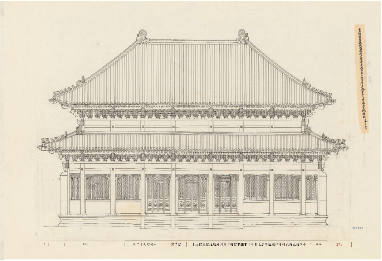 目前,已知现存清代官修“建筑工程类则例”数十种,而《工程做法则例》是其中系统化最早、历时最久、推行最广的一部。它按照清代营造业的八大作别,即木、石、瓦、土、搭材、油、画、裱作分卷编排,共74卷,前27卷大木作,包括27类大式、小式建筑,接下来13卷是斗科,再往后依次是装修(门窗槅扇与天花)、石作、瓦作、土作、搭材作、油饰彩画作、裱糊作,从第48卷开始是各类用料、用工。各卷将建筑或其部件拆解为构件,逐一述明尺寸、工料、限额,虽便于造价计算和审核,但存在不小局限,即在记录名词术语、建造程序、整体及构件样式等方面逊于《法式》,甚至曾被梁先生诟病“体例拙陋”,充分反映了《则例》更多是以工程奏销核算,杜绝营私舞弊为出发点。而最令后世研究者无从入手且不逮《法式》的是其“有法无图”的缺陷。原《则例》仅在前27卷每卷有一张大木图式(山架图)墨线图,且无法与文献尺寸相对应。